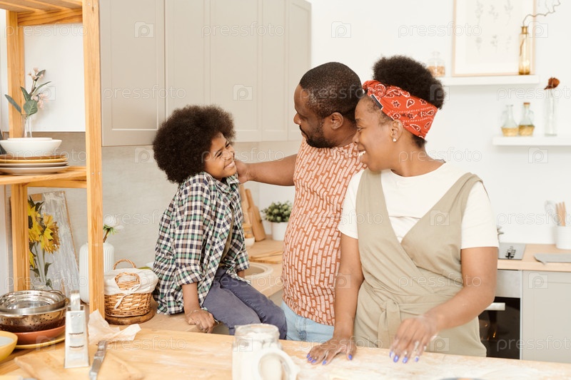 Счастливые молодые родители и милый маленький сын, готовящие вместе