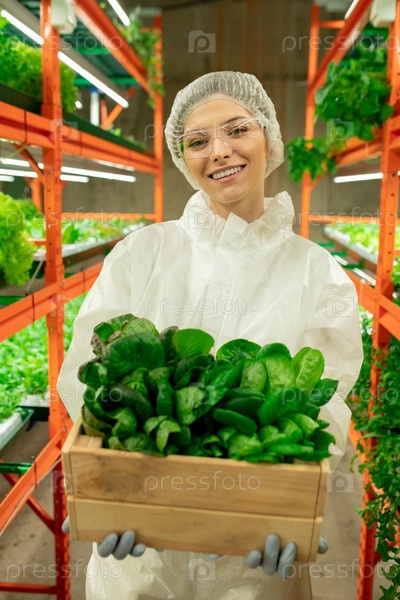 Молодая улыбающаяся агроинженерка с зелеными саженцами шпината смотрит на тебя
