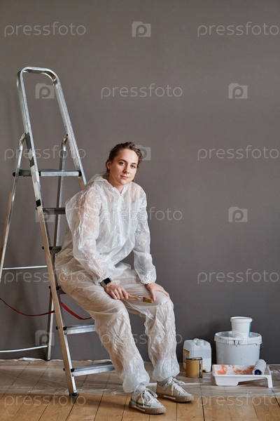 Вертикальный снимок красивой молодой женщины в защитной одежде, выполняющей ремонтные работы в своей квартире, сидящей на лестнице и смотрящей на камеру