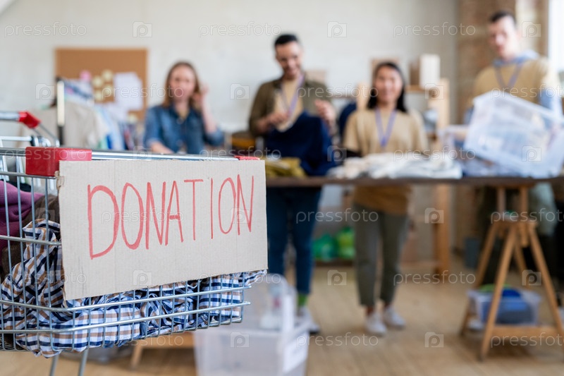 Торговая корзина с одеждой для пожертвований против ряда добровольцев