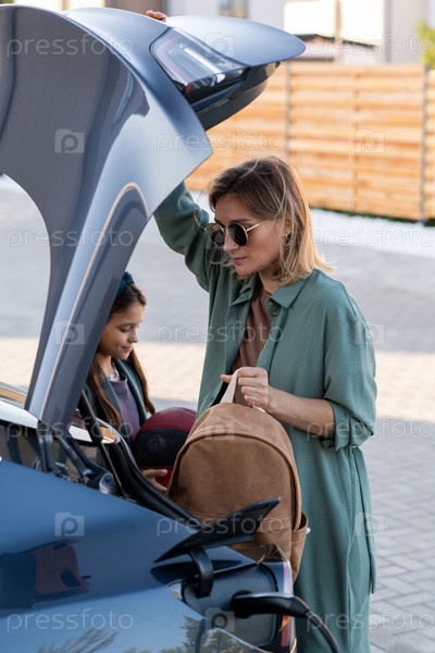 Мать и дочь вынимают вещи из багажника во время зарядки автомобиля