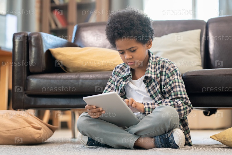 Умный серьезный ученик африканца смотрит онлайн образовательное видео на полу