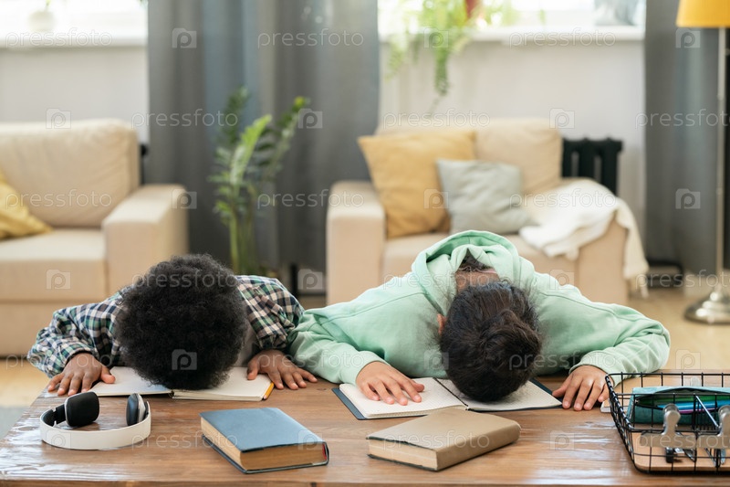 Уставшие ученики начальной школы в повседневной одежде, лежащие на своих открытых копиях