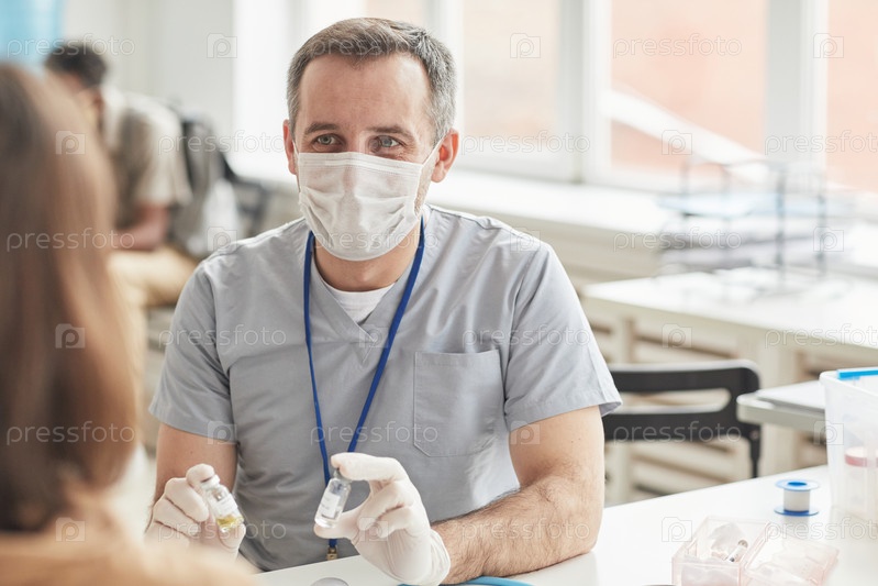 Зрелые врачи консультируют пациентов в центре вакцинации