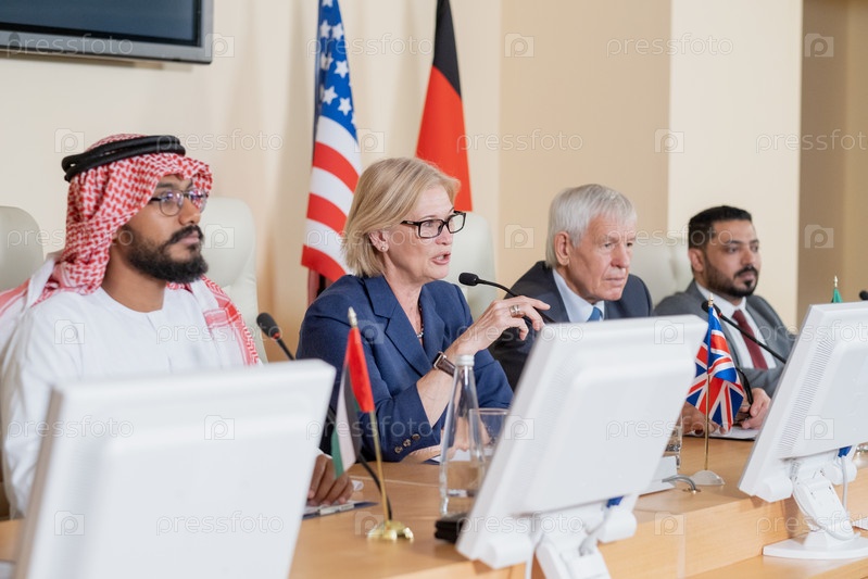 Блондинка зрелая представительница делегации, выступающая с речью перед аудиторией