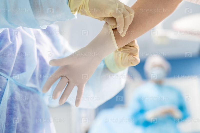 Помощник надевает защитную перчатку на руку хирурга перед операцией