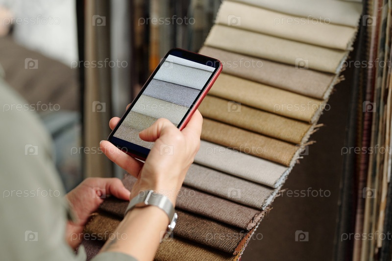 Рука молодой клиентки, фотографирующей новые образцы текстиля для мебели