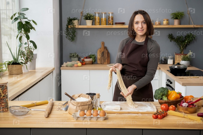 Счастливая молодая женщина с вареным спагетти стоит у кухонного стола