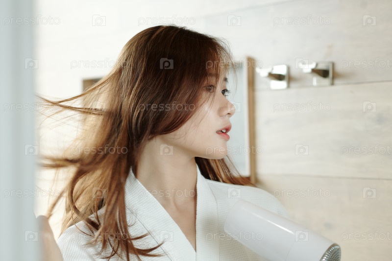 Женщина дует, высушивая волосы
