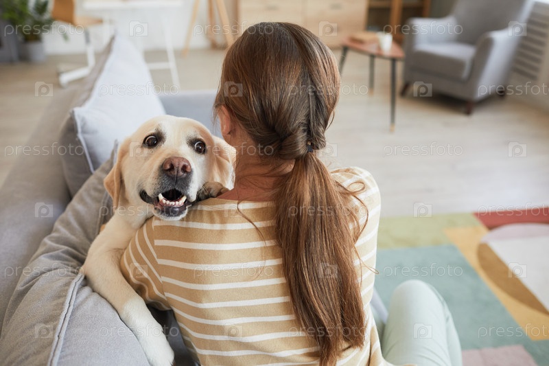 Женщина, играющая с собакой на диване
