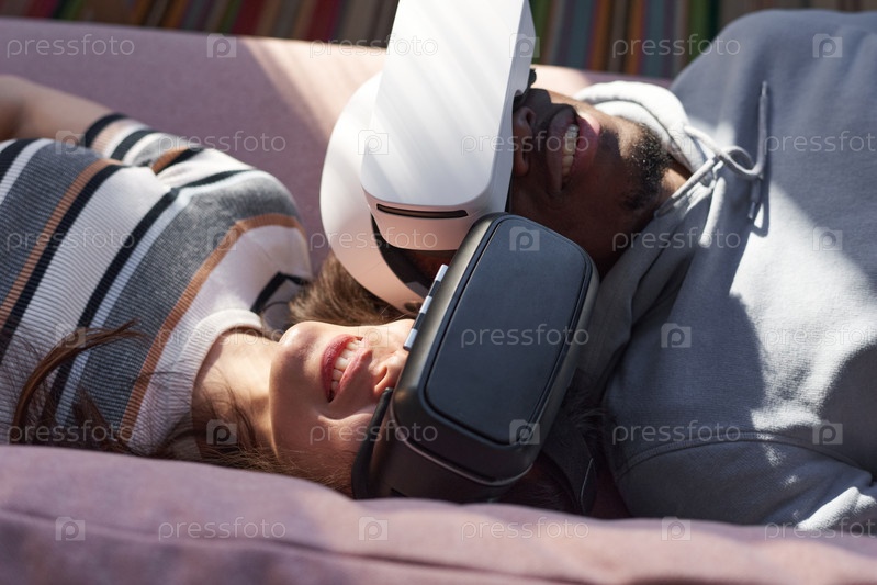 Пара в гарнитурном устройстве лежит на диване дома