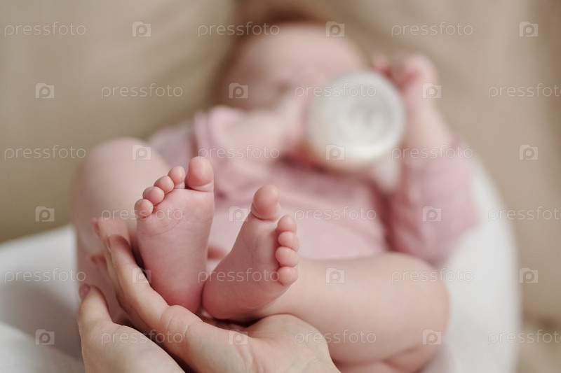 Голые ноги симпатичной девочки на ладонях ее матери
