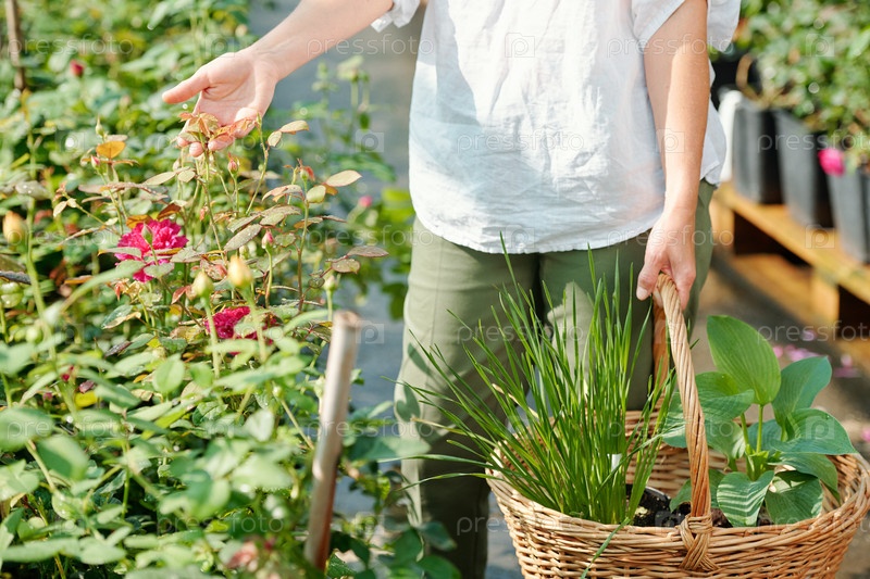 Рука современной садовницы с корзиной, держащей листья растущих розовых роз