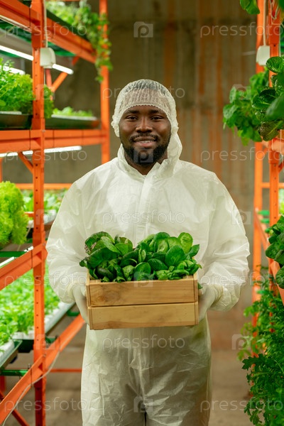 Молодой веселый агроинженер африканской этнической принадлежности, работающий внутри вертикальной фермы