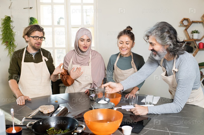 Счастливый зрелый бородатый мужчина держит кухонный инструмент над металлической сковородкой с кипящей водой во время приготовления пищи