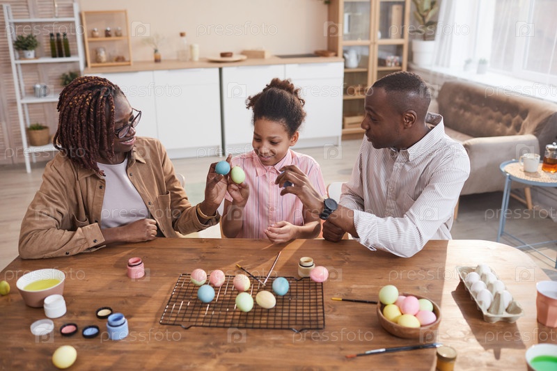 Счастливая афроамериканская семья рисует пасхальные яйца вместе