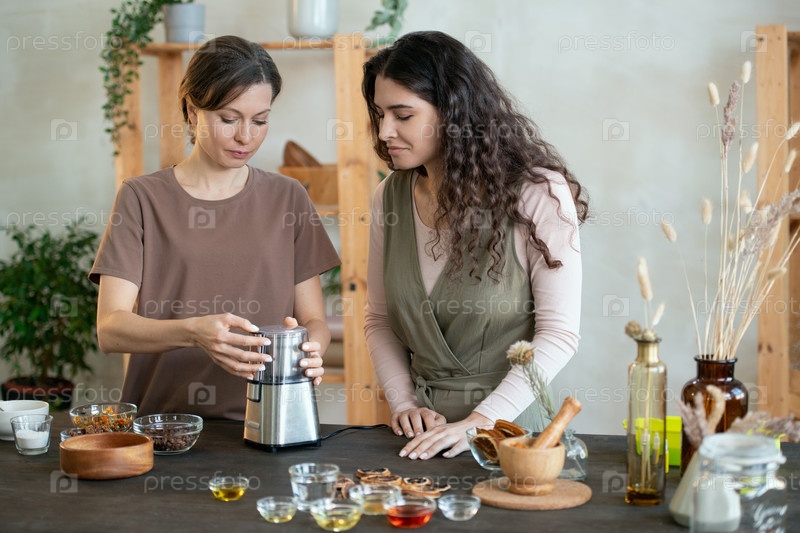 Молодая женщина использует электрический прибор для измельчения ингредиентов для ручного мыла