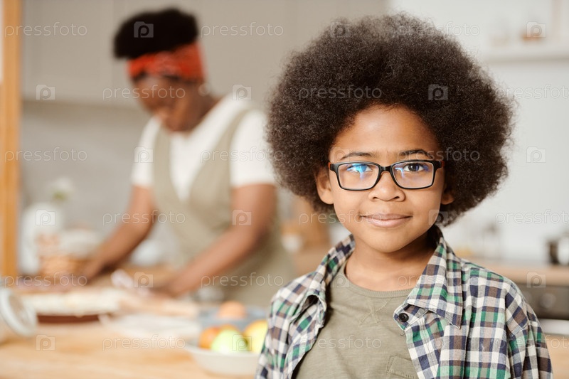 Милый молодой человек в повседневной одежде и очках стоит на кухне