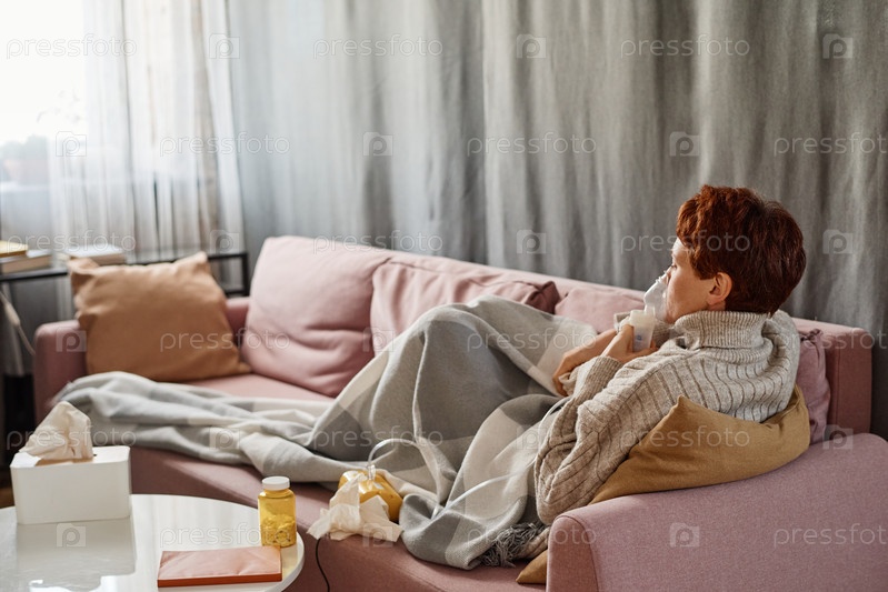Горизонтальный снимок современной зрелой женщины, страдающей гриппом, которая сидит дома и отдыхает на диване с помощью небулайзера