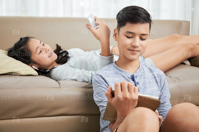 Братья и сестры, отдыхающие с гаджетами