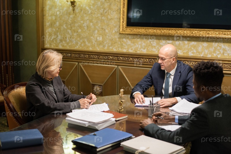Группа современных юристов, сидящих за столом и обсуждающих