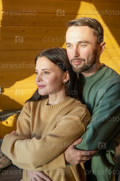 Молодой ласковый муж обнимает жену, стоя перед окном