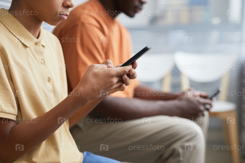 Афроамериканский мальчик держит смартфон в очереди