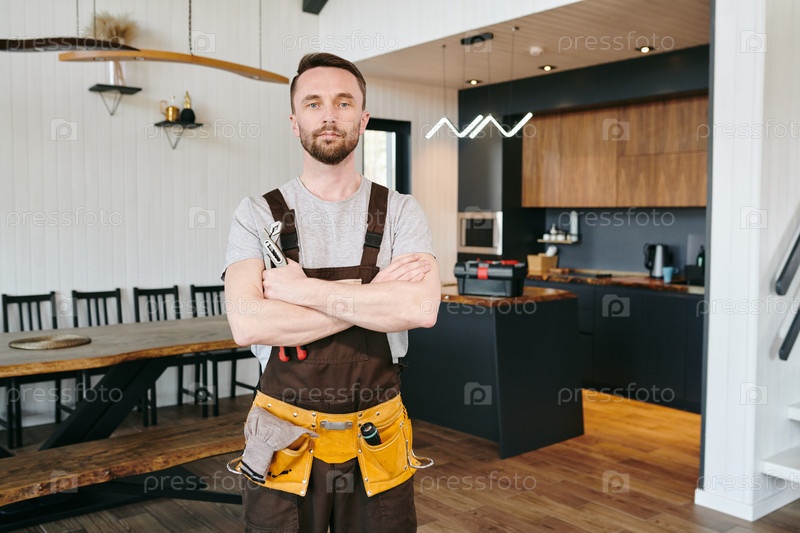 Молодой сантехник с английским ключом пересекает руки за грудь