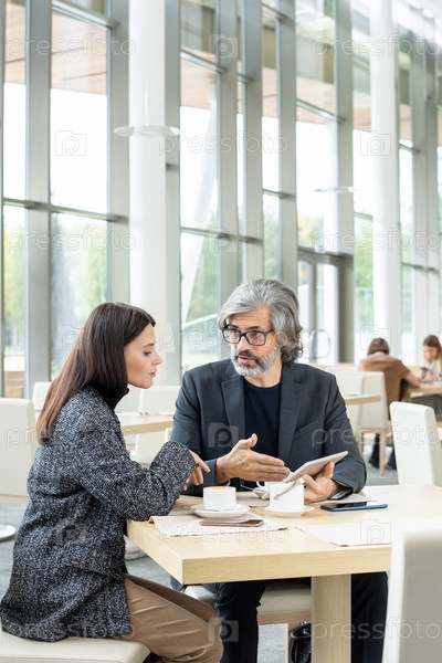 Молодая серьезная бизнесвумен слушает зрелого коллегу-мужчину с планшетом