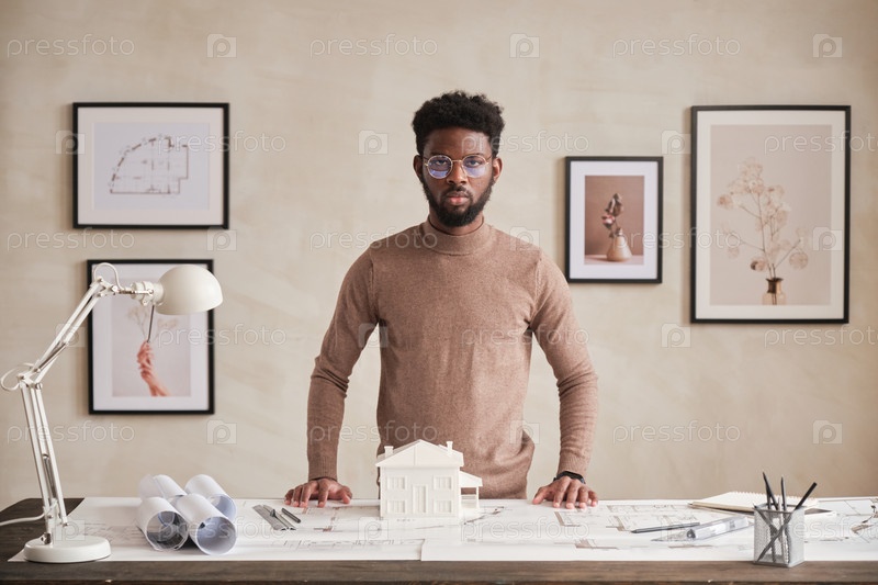 Портрет уверенного архитектора в офисе с минималистичным интерьером