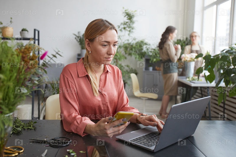 Деловая женщина, использующая ноутбук в цветочном магазине