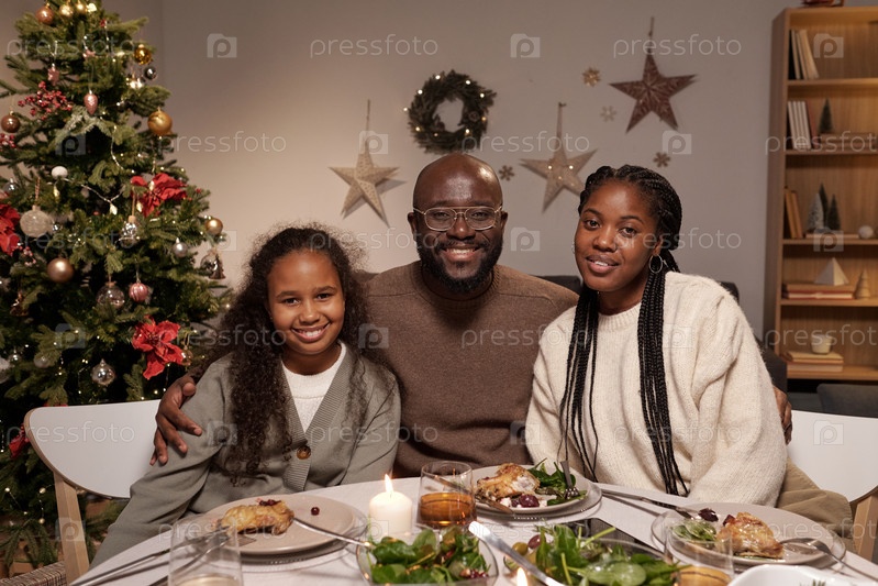 Счастливая молодая семья из трех человек смотрит на вас с улыбкой
