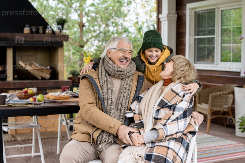 Счастливый школьник и его любящие бабушка с дедушкой в теплой повседневной одежде смеются