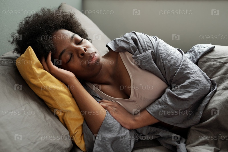 Молодая расслабленная женщина африканской этнической принадлежности спит в постели