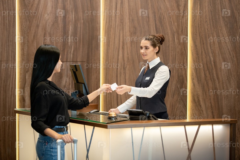 Молодая брюнетка-рецепционера в униформе стоит у прилавка и передает пластиковую карточку гостю
