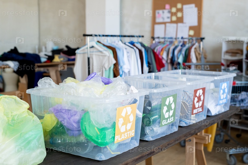 Четыре контейнера с сортированными отходами на столе