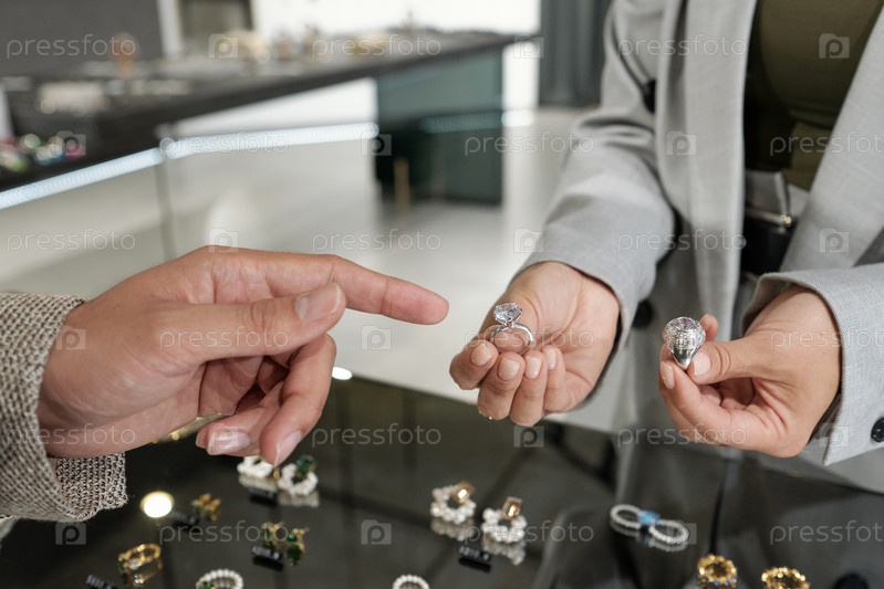 Молодая женщина держит два кольца, в то время как клиент-мужчина указывает на одно из них
