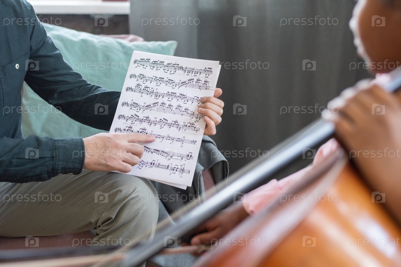Рука молодого учителя музыки, указывающего на лист с нотами
