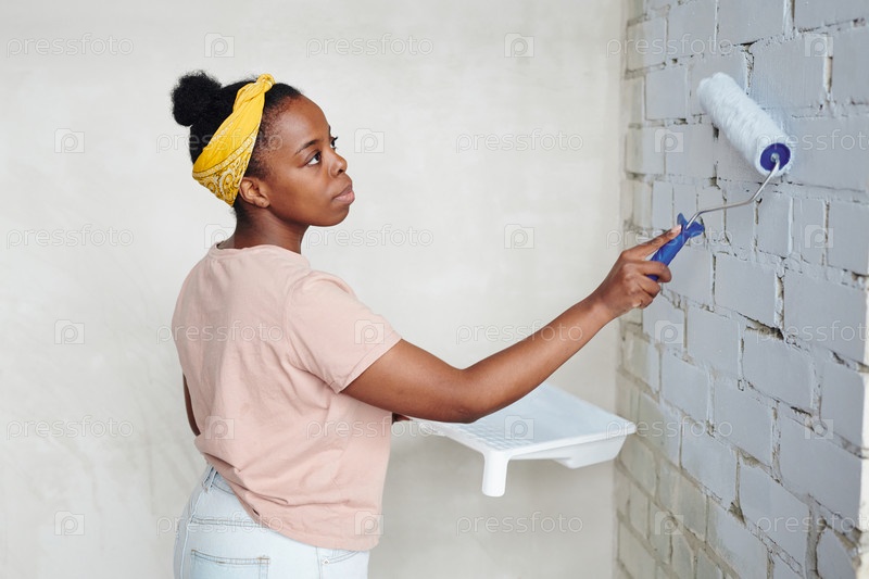 Молодая серьезная африканская женщина с пайнтроллером стоит в углу и рисует кирпичную стену