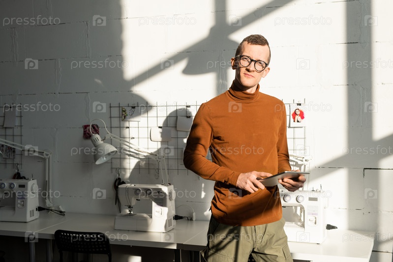 Молодой человек в очках и повседневной одежде, использующий планшет