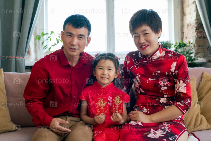 Любящий отец, мать и дочь празднуют китайский Новый год