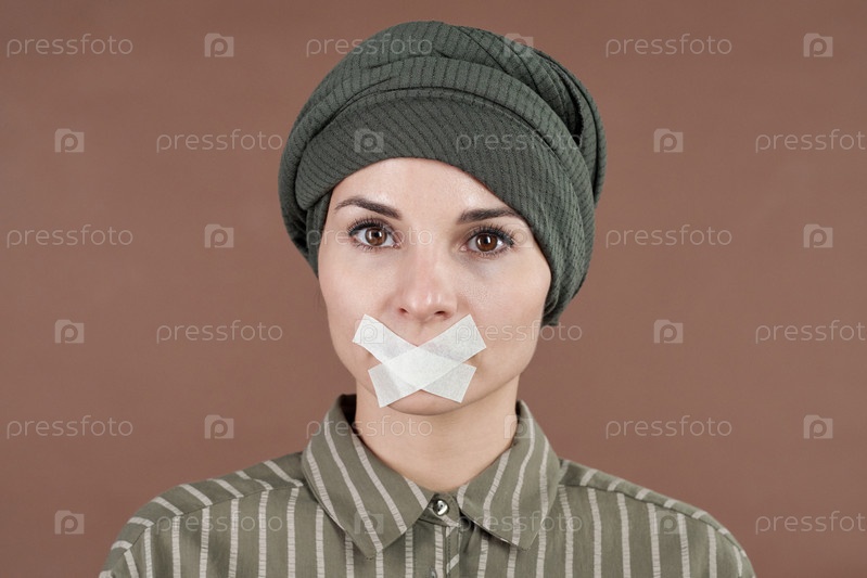 Современная молодая мусульманка с лентой на рту