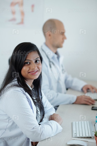 Врач сидит за столом рядом со своим коллегой
