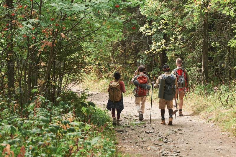 Задний вид молодых туристов с рюкзаками, идущих по лесной тропе во время совместной прогулки