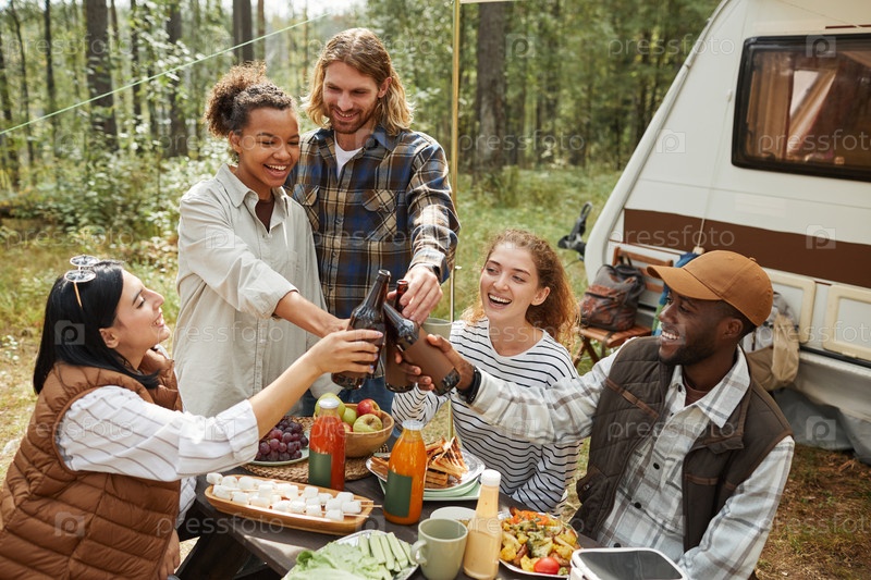 Группа друзей, обедающих на свежем воздухе в кемпинге