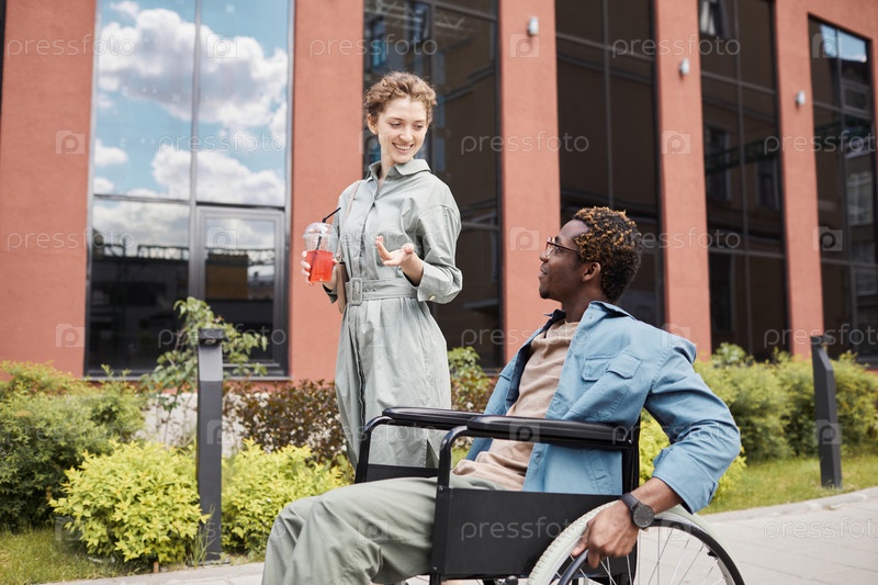 Красивая женщина с коктейлем разговаривает с инвалидом