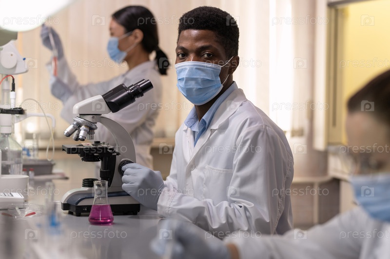 Молодой африканский химик-мужчина в защитной одежде