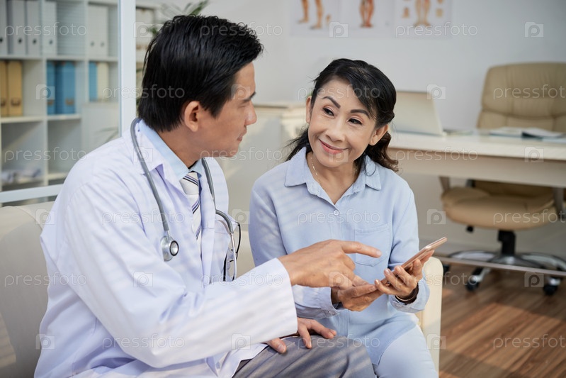 Врач показывает телемедицинское приложение пациенту