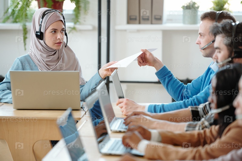 Молодая женщина дает сценарий коллеге