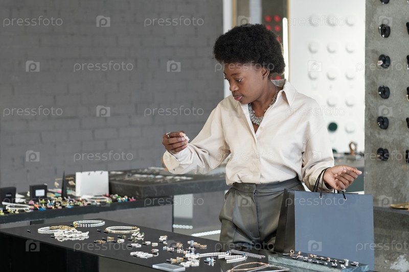 Молодой африканский потребитель стоит на большом дисплее с ювелирными украшениями